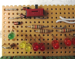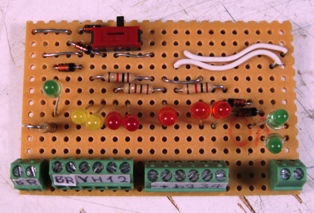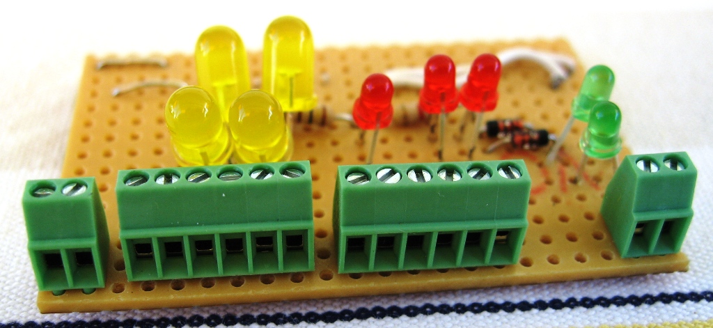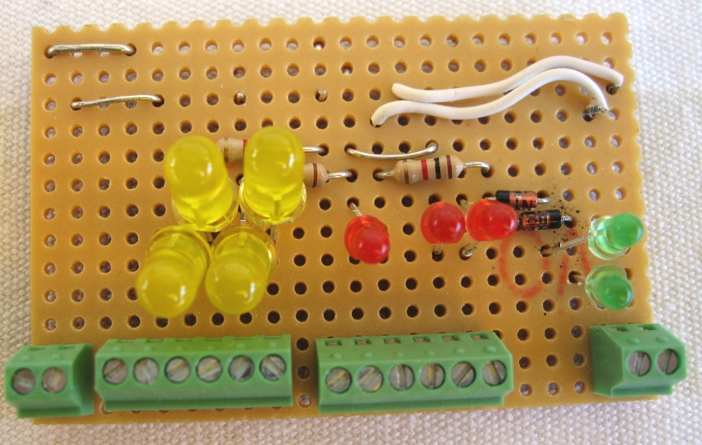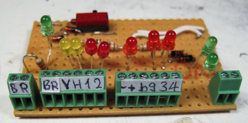 beziehe oder auf von der Platine. Zudem habe ich für eine bessere Übersichtlichkeit und Ablesbarkeit die 4 grossen gelben LED's gegen 2 kleine gelbe (Licht vorne und hinten) und 2 rote getauscht (F1 und F2) Des Weiteren habe ich links eine grüne LED eingebaut zur Überwachung der Stromversorgung. B = Braun => Schaltplan folgt noch