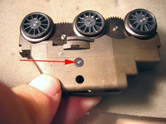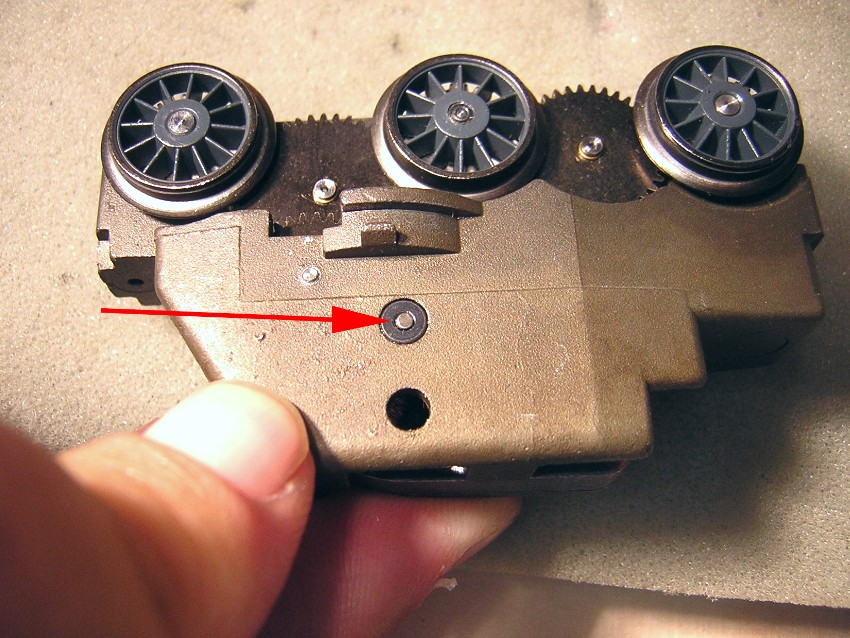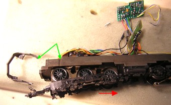 Herausnehmen des Motorblocks Um den Motor austauschen zu können muss der Motorblock und damit des Drehgestell herausgenommen werden. Dies ist nicht ganz einfach. Am besten geht man wie folgt vor: 9.1:Ausklinken des Schienenräumers (grüne Pfeile): oben leicht nach aussen drücken und nach unten herausnehmen 9.2: Radabdeckung leicht nach unten ziehen und nach