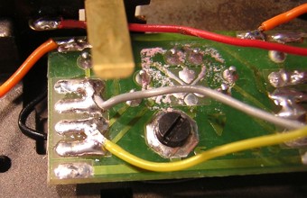 Die beiden obersten Punkte links uns rechts sind frei verwendbar. Ich verwende sie als Stützpunkt für die orangen Kabel. Orange entspricht dem positiven Potential und wird als Rückleiter für die flackerfreie Ansteuerung der Beleuchtungen benötigt. die beiden Lötpunkte unten links und rechts sind mir der Masse (braun) verbunden => in der Vergrösserung sieht man die Verbindung mit der Schraube. Diese beiden Lötstellen stellen wiederum ideale Lötstützpunkte für die Masse dar. |