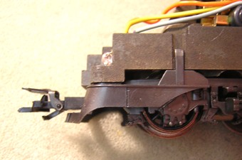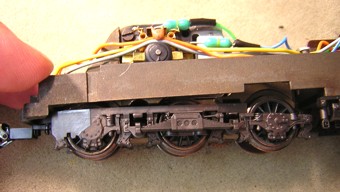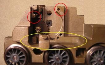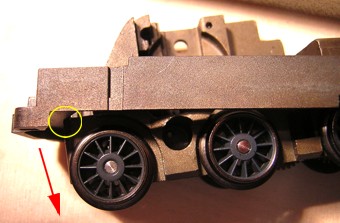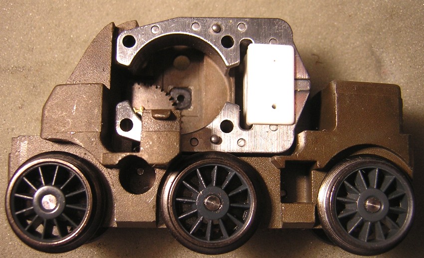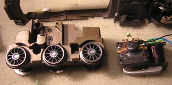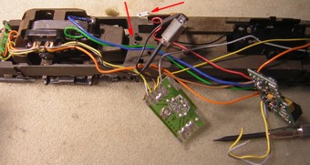 Am hier verwendeten Motorschild waren die beiden grünen Drosseln bereits ab Werk angelötet. Im Umbausatz 60901 liegen sie separat bei und werden entweder jetzt oder nach dem Einbau des Drehgestells angelötet. |
