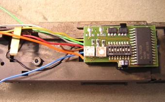 Schritt 16: Einbau des Decoders 60902. Dieser wird ganz einfach in die Halterung des elektronischen Umschalters eingeklippst. Sinnvollerweise werden die Kabel von der rechten Seite unter dem Decoder durchgeführt. (das sind alle Kabel, ausser dem orangen) | ![]() |