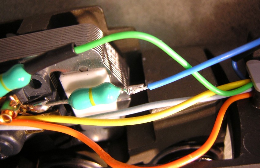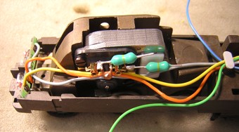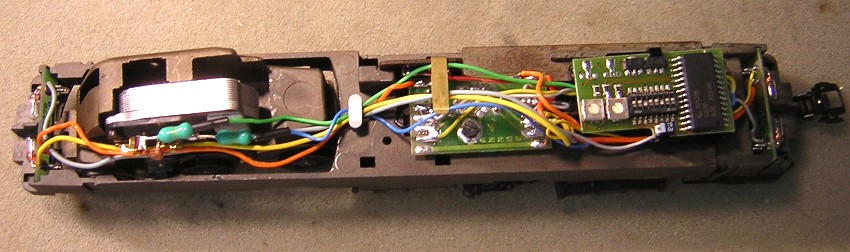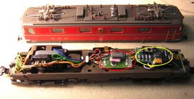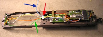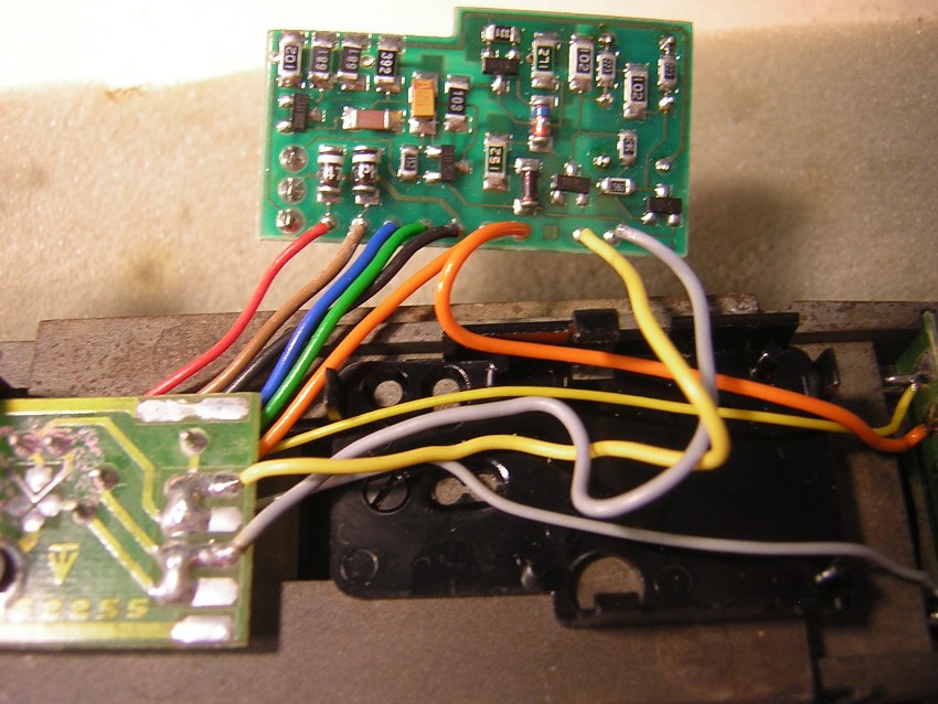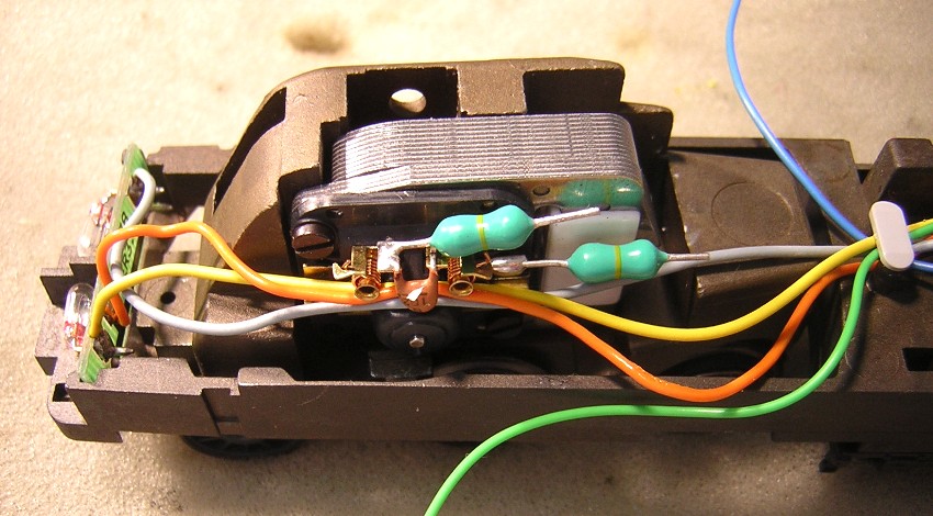 Damit sind alle Kabel des Decoder angeschlossen ausser blau und grün für den Motor. Auch die Lampen sind bereits wieder richtig angeschlossen |