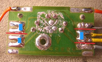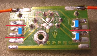 Im nebenstehenden Bild ist der obere grüne Anschluss bereits fertig. Der blaue Anschluss ist angelötet -> jetzt fehlt noch der Schrumpfschlauch. Wer genau hinschaut, stellt fest, dass ich gegenüber Schritt 23 die Anschlüsse blau und grün tauschen musste. |