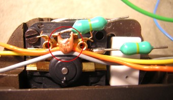 Lichtwechselplatine (LWP) vor dem Ausbau: die Drossel des Motors (hellblauer