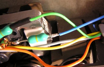 und grün provisorisch an die beiden Drosseln angelötet.