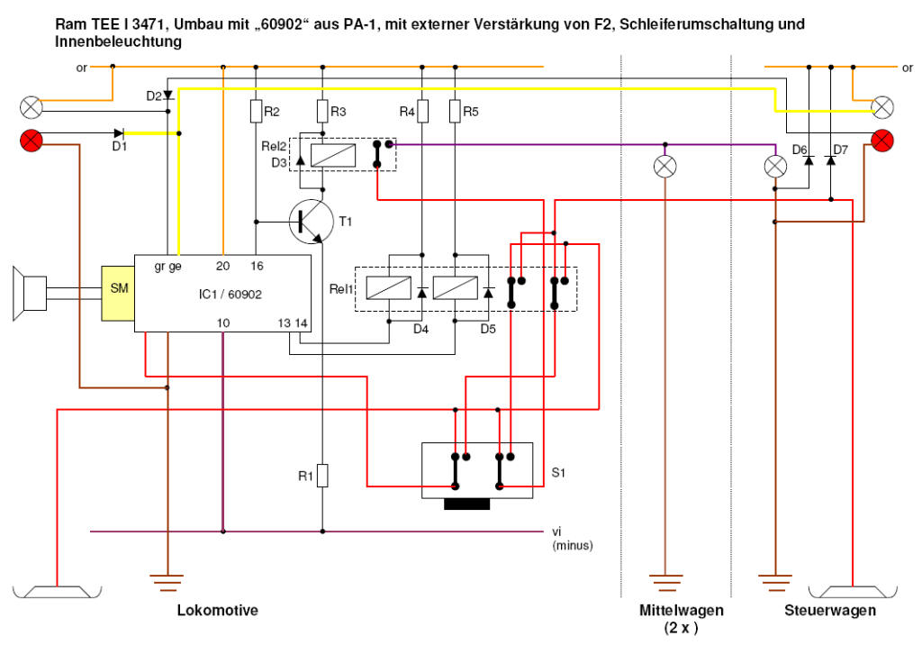 (violett) und die Stirnbeleuchtung sowie den Schleifer im Steuerwagen |