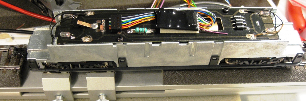 a) wesentlich schlechtere Regeleigenschaften haben als die Original ESU-Decoder und b) nur beschränkt einstellbar sind oben sieht man den Original Roco Decoder in einer Re 460. Dieser ist dank dem 8 poligen Stecker sehr leicht gegen einen ESU 52610 austauschbar.