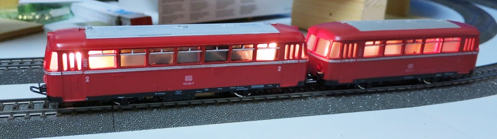 Dieser Schienenbus war in sehr schlechtem Zustand; unter anderem mehrere Löcher im Dach, da der Vorbesitzer versucht hatte, daraus einen Turmtriebwagen zu bauen. Die beiden Anhänger habe ich ebenfalls mit einer schaltbaren Innebeleuchtung versehen: Details hierzu sind unter Modellbahnbeleuchtung / Schienenbus zu finden: Schienenbus