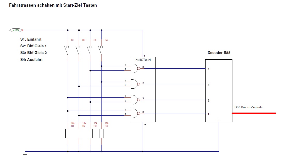 Bei diesem kleinen Beispiel braucht es für 4 Fahrstrassen genau 4 Tasten. Bei grösseren Bahnhöfen mit komplexeren Ein- und Ausfahrten, bietet die Start-Ziel Tasten die Sicherheit, die richtige Fahrstrasse mit wenigen Tasten auwszuählen. Um einen Eingang eines S88-Decoders zu triggern und damit eine Fahrstrasse auszulösen muss das Eingangssignal identisch mit Masse sein. Mit nachfolgender Schaltung lässt sich dies einfach lösen: